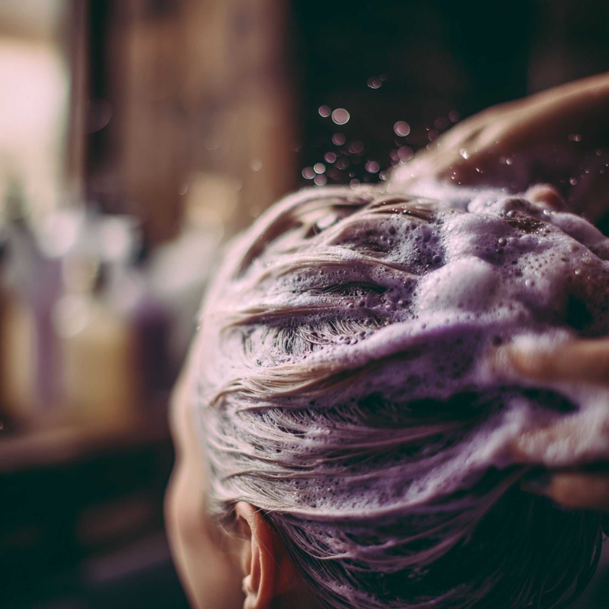 Massage the Super Nutrient Purple Shampoo into wet hair, focusing on areas where brassiness is most noticeable.